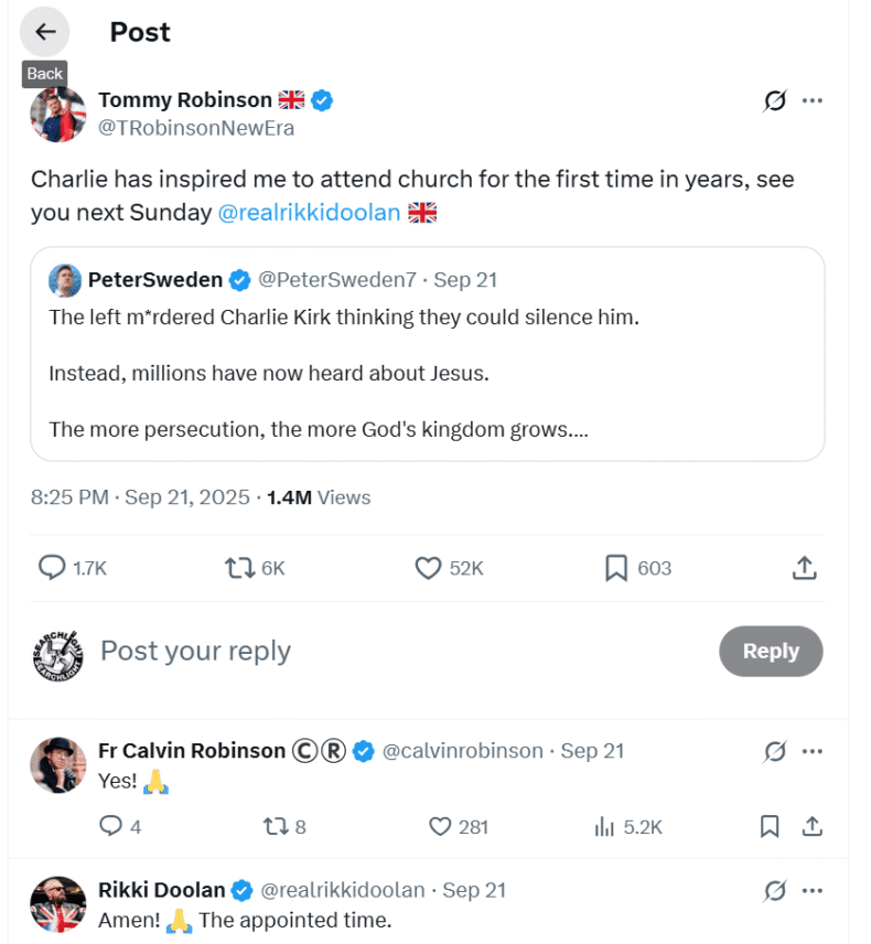 That’s right, ‘Tommy Robinson’ in church. “For the first time in years”, he told us.