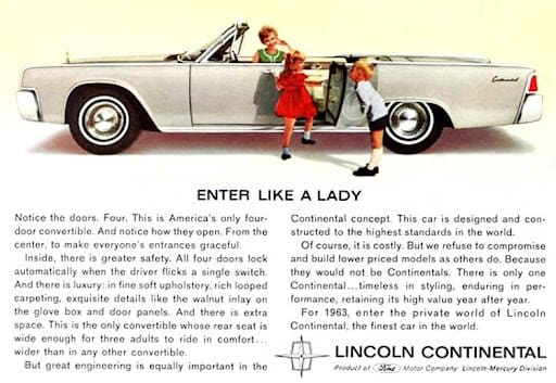 It projected authority and modernity, famously serving as the presidential limousine for John F. Kennedy. The 1961–69 Continental defined mid-century American luxury with understated confidence.