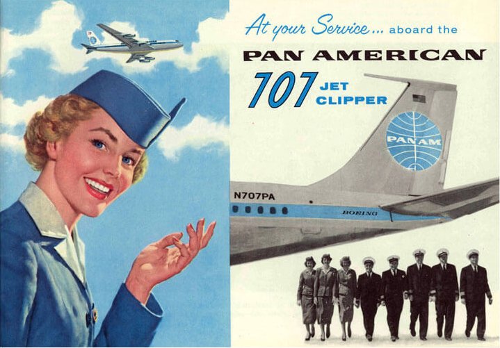 In 1958, Pan Am inaugurated the first commercial jet service with the introduction of the Boeing 707, a milestone that dramatically reduced travel times and redefined passenger expectations. Suddenly, the world seemed smaller. A journey from New York to Paris that once took over a day could now be completed in hours. Pan Am marketed this new era with sophistication, emphasising luxury, speed, and global connectivity. Its brand became synonymous with elegance: stewardesses in tailored uniforms, globe-spanning route maps, and the iconic blue globe logo.