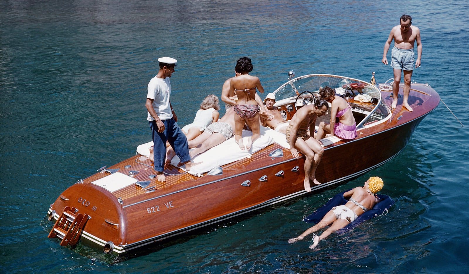 Aarons was less concerned with formal portraiture than with staging scenes of lifestyle. His images are frequently arranged as tableaux: figures casually distributed around a pool, at a cocktail party, or on a yacht. The composition invites the eye to wander, discovering details that suggest a story—the tilt of a sunhat, the placement of a champagne flute, the geometry of a diving board.
